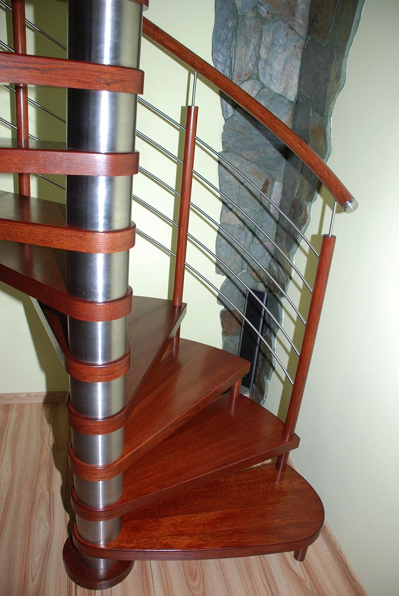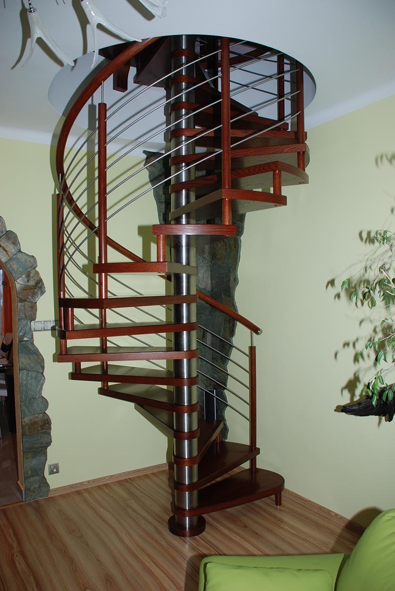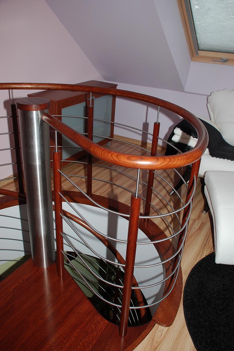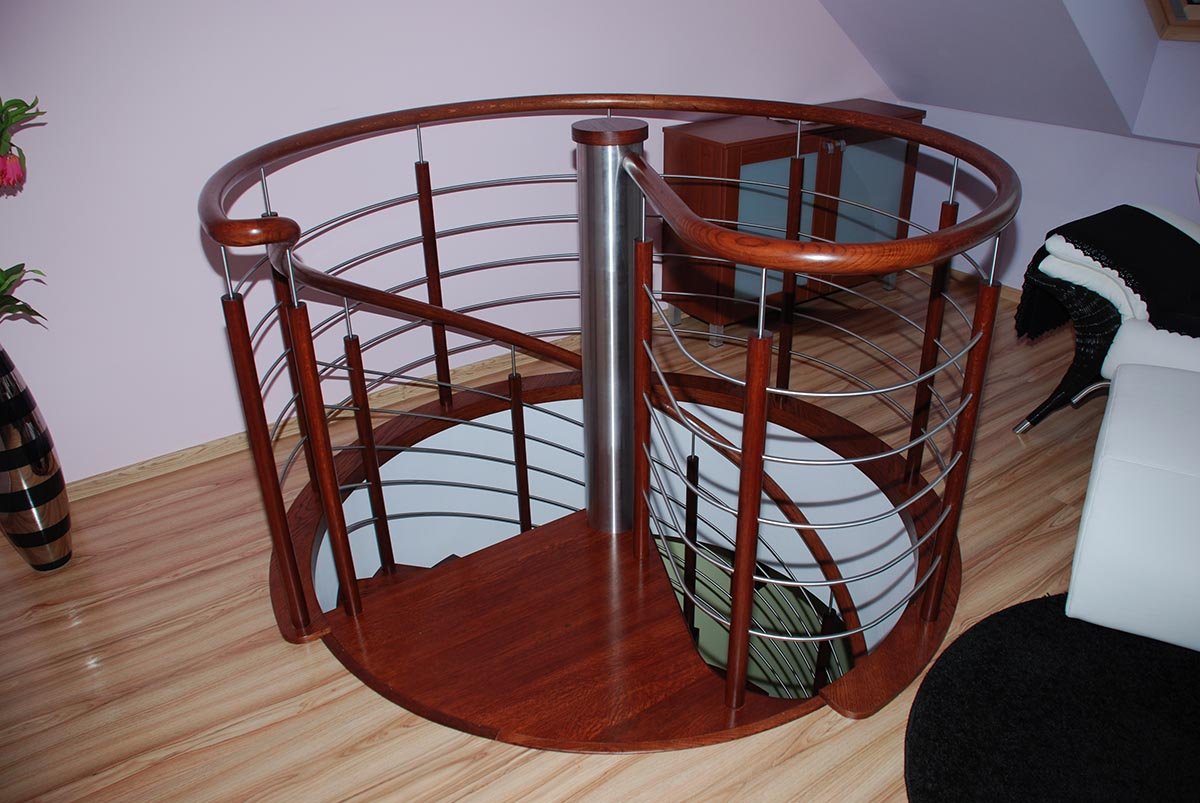 Schody kręte ażurowe ze słupem ze stali nierdzewnej. Balustrada metalowo-drewniana. Materiał dąb bejcowany.