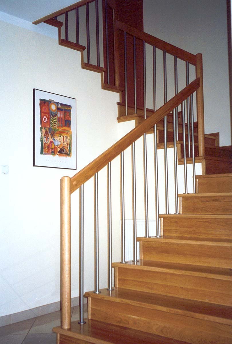 Schody pełne na betonie. Balustrada z rurek nierdzewnych pionowych. Materiał dąb naturalny.