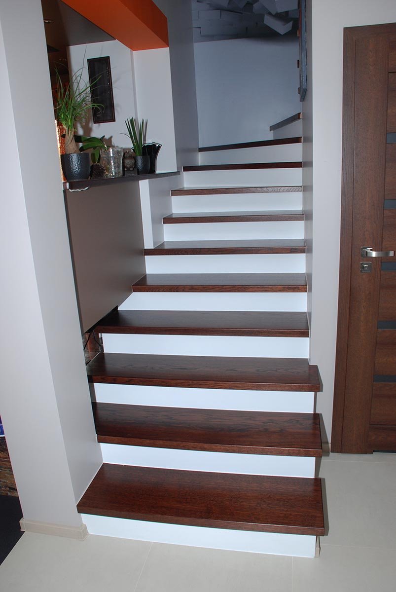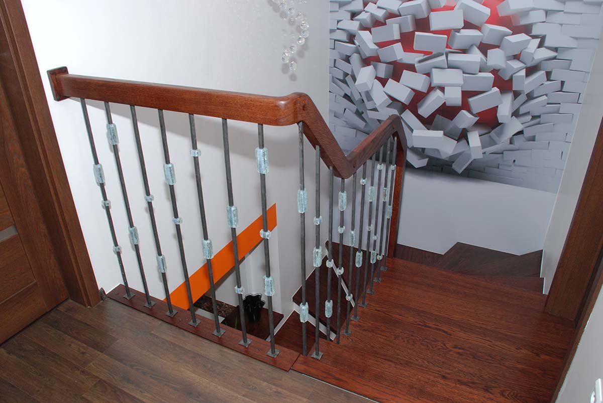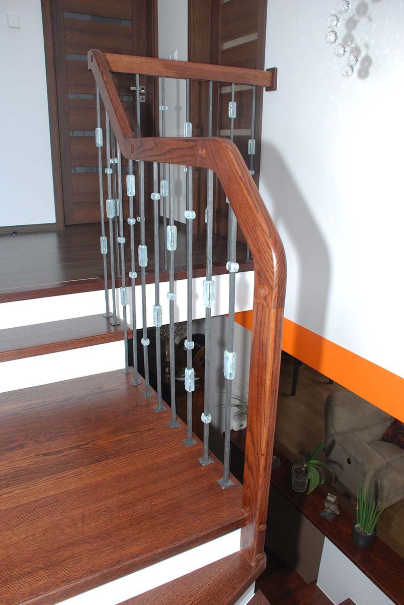 Blaty drewniane na schodach betonowych. Podstopnice z płyty g-k. Balustrada z metaloplastyki z „soplami” ze szkła. Materiał dąb bejcowany.