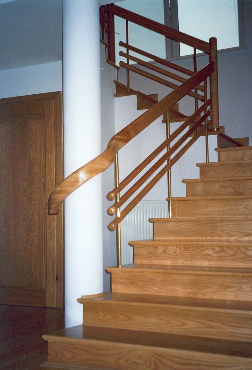 Schody drewniane pełne na schodach betonowych. Balustrada z drążków drewnianych równoległych do biegu schodów. Materiał‚ dąb naturalny.